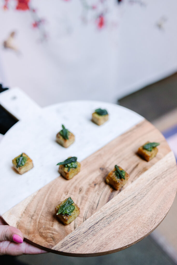 Let’s talk aesthetics. Food that’s thoughtfully plated is not only a treat for the palate, but for the camera, too. In fact, some of my favorite flatlay and candid reception shots involve canapés like the ones shown here—miniature works of art. Whether it’s rosemary sprigs atop whipped ricotta, edible florals, or gold-dusted macarons, small bites pack a big visual punch.